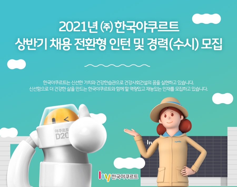 전형 절차는 서류전형, 인·적성 검사, 실무면접, 인턴교육, 임원면접 순으로 진행한다. 원서 접수는 2월 16일 16시까지며, 한국야쿠르트 채용 홈페이지에서 가능하다. 서류전형 합격 여부는 2월 23일에 발표한다.