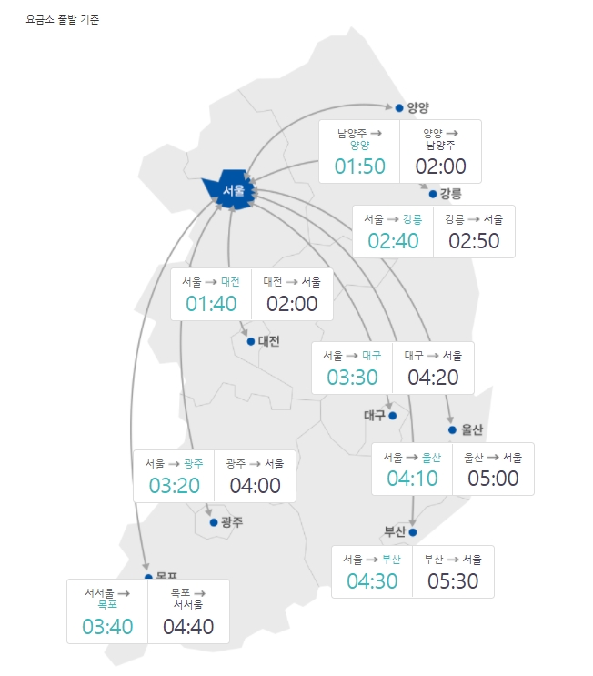 이날 오후 1시 기준 서울요금소를 출발해 전국 주요 도시에 도착하는 데 걸리는 예상시간은 ▲부산 4시간 30분 ▲대구 3시간 30분 ▲목포 3시간 40분 ▲광주 3시간 20분 ▲대전 1시간 40분 ▲강릉 2시간 40분이다.