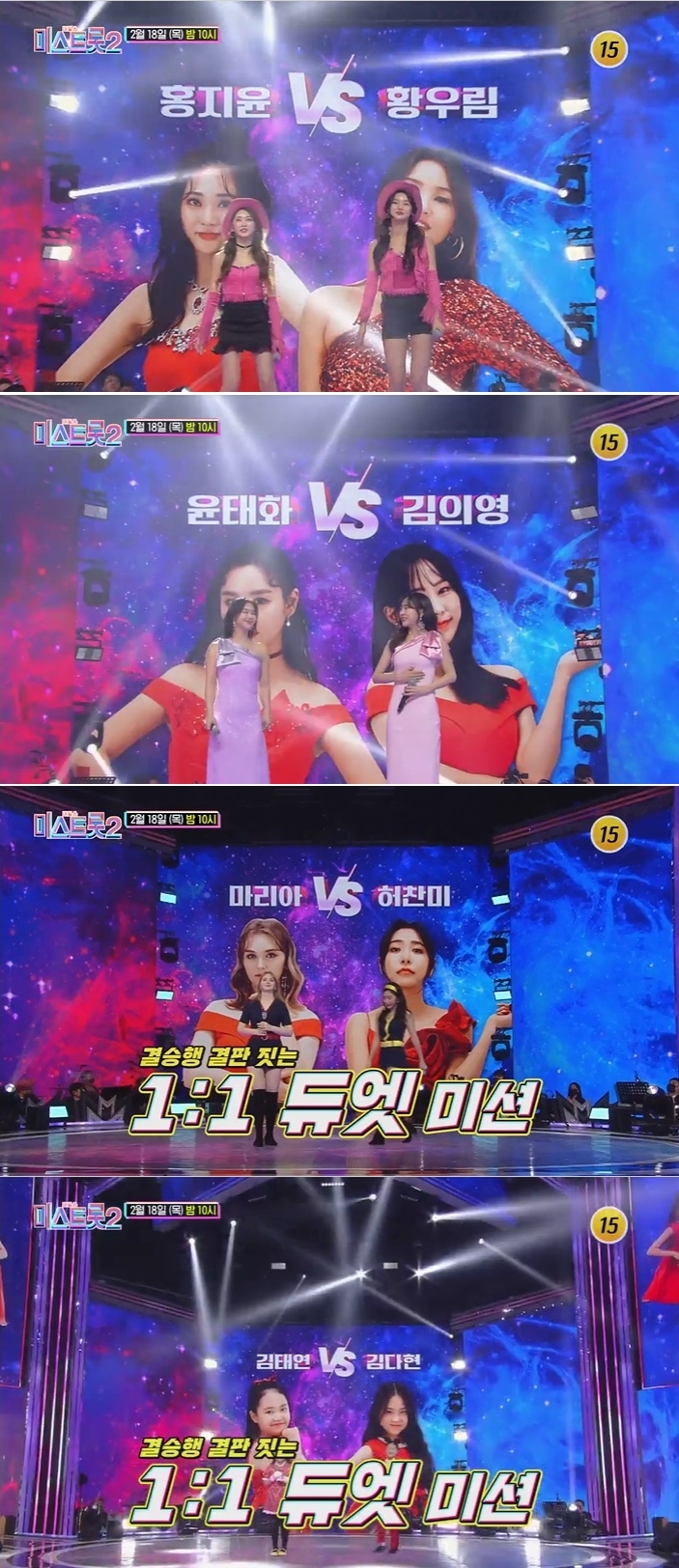 지난 15일 선공개된 '미스트롯2' 10회 예고 영상에 따르면 결승진출자 톱7을 가리는 1:1 듀엣 미션은 최연소 팀 김다현vs김다현을 비롯해 막강한 우승 후보 홍지윤vs황우림, 김연지vs은가은, 윤태화vs김의영, 마리아vs허찬미, 강혜연vs양지은, 별사랑vs류원정이 맞붙는다.