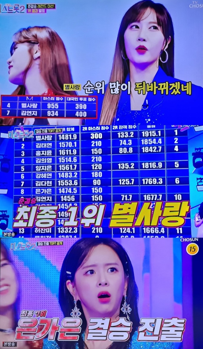 이미지 확대보기18일 밤 방송된 TV조선 '내일은 미스트롯2'(이하 '미스트롯2') 10회에는 준결승 진출자 14명 중 1라운드 레전드 미션과 2라운드 1 대 1 한 곡 대결을 통해서 별사랑이 1위로 당당하게 결승에 진출했다.
