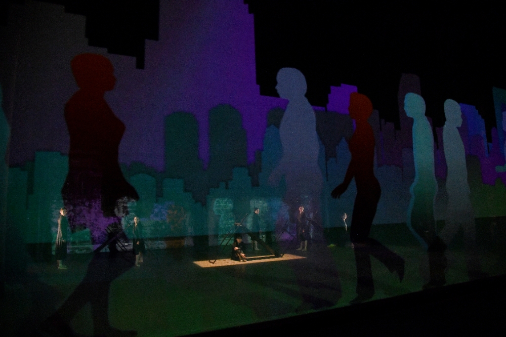 이미지 확대보기「보이지 않는 것들」의 장면은 ‘프롤로그’, ‘경계와 고립’, ‘달콤한 무지’, ‘상실의 도시’, ‘애도와 희망’의 4장으로 구성되어 있다. 프롤로그는 루이빌의 분위기를 불러오는 레이첼(Rachel's)과 묘한 기분으로 들뜨게 만드는 필립 글라스(Philip Glass)의 반복적 구도의 음악으로 시작된다. 여러 곳을 여행하며, 소소하게 즐기던 일상이 꿈길 같은 행복으로 비치는 영상이 빠르게 스쳐 지나간다. 바닥의 셔레이드 효과와 배경의 암시가 추상적인 신비감을 불러일으킨다.