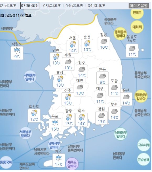 이미지 확대보기중국 상해부근에서 발달해 북동진하는 저기압의 영향으로 2일 밤부터 제주도와 전남남서해안부터 비가 시작되어 3일 오전에는 수도권과 강원영서북부, 충남, 전북, 전남권내륙, 경남서부에도 비가 오겠고, 오후 12~6시에는 전국으로 확대되겠다.
