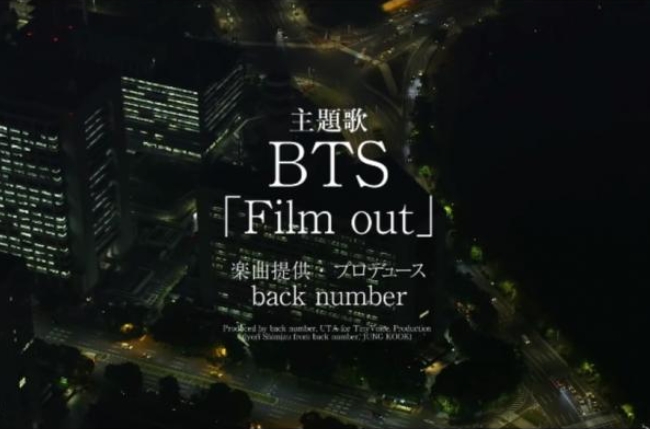 일본의 3인조 록밴드 백 넘버(back number)와 콜라보 한 ‘Film out’은 BTS 멤버 정국이 작곡에도 참여한 일본에서의 오리지널 발라드곡이다. 뮤직비디오에서는 7명의 멤버가 시간이 지나도 마음속에서 사라지지 않는 누군가를 그리워하는 공허하고 쓸쓸한 모습을 표현하고 있으며, 4월 5일 14시 43분 현재 조회 수가 5,342만 회를 초과하는 등 뜨거운 시선이 쏠리고 있다.