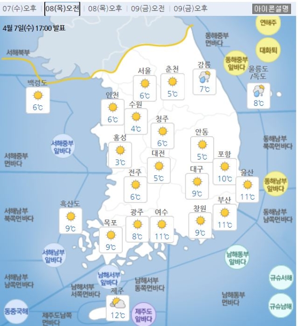 주요 지역 아침 최저 기온은 서울 6도, 인천 6도, 수원 4도, 춘천 5도, 강릉 7도, 청주 6도, 대전 5도, 전주 6도, 광주 8도, 대구 9도, 부산 11도, 제주 12도다.
