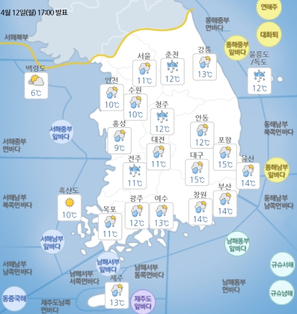 서리와 얼음, 농작물 냉해 대비도 대비해야 한다. 모레(14일)와 글피(15일) 새벽부터 아침 사이 지표 부근의 기온이 영하권으로 떨어지는 중부내륙과 강원산지, 경북북동산지, 전북동부에는 서리가 내리고 얼음이 어는 곳이 있겠다.