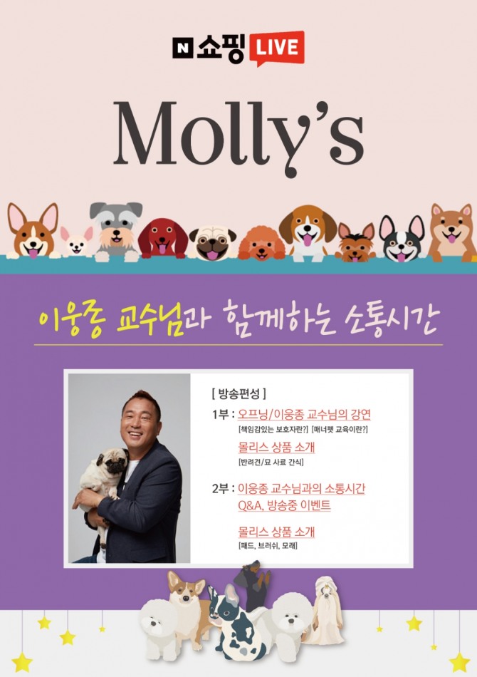 이마트는 이웅종 교수에게 반려동물 관련 질문을 남긴 시청자 중 일부를 추첨으로 선발해 몰리스 상품을 증정한다. 몰리스 스마트스토어를 찜하거나 ‘방송 알림 받기’를 설정한 고객은 몰리스 할인 쿠폰을 받는다.