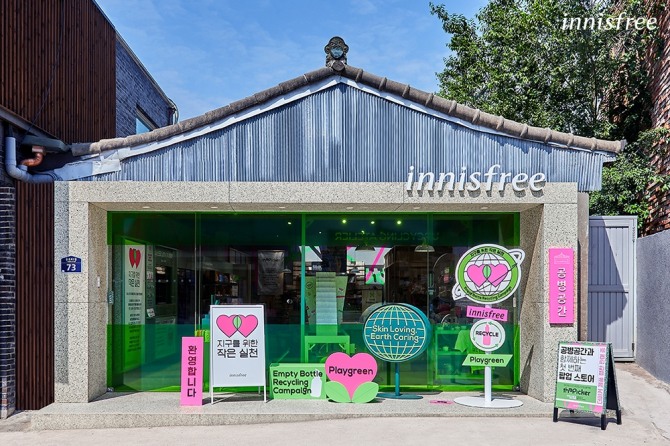 이미지 확대보기공병공간은 2003년부터 ‘공병수거 캠페인’을 진행해온 이니스프리가 자원 순환의 가치를 전달하기 위해 선보인 매장이다. 2017년 6월 서울 종로구 소격동에 첫선을 보인 공병공간은 80년 된 한옥 두 채를 연결하고 목구조는 그대로 살리는 동시에 23만 개의 이니스프리 공병을 분쇄해 만든 마감재를 활용한 인테리어로 화제가 됐다.