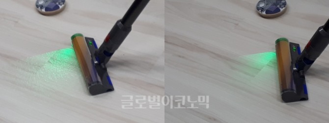 이미지 확대보기빨간색 전원 버튼을 누르니 소리가 나면서 청소기 헤드에 초록빛 레이저가 켜졌다. 레이저가 켜진 곳에 먼지들이 있는 게 보였다. 분명 청소기를 가동하기 전까지만 해도 눈에 보이지 않던 먼지들인데, 마술이라도 본 것처럼 신기했다.