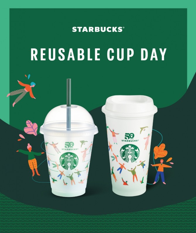행사 당일 매장을 방문해 제조 음료를 주문하면 글로벌 스타벅스 50주년 기념 특별 디자인으로 만든 그란데(16oz) 크기의 다회용 컵에 음료를 담아준다. 컵의 크기를 고려해 행사 하루 동안 숏, 톨, 그란데 사이즈로만 주문이 가능하다.