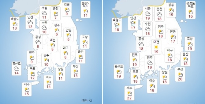 전국 주요지역별 온도는 ▲서울 11~19도 ▲인천 12~17도 ▲수원 10~18도 ▲춘천 7~18도 ▲강릉 9~19도 ▲청주 9~18도 ▲대전 9~19도 ▲전주 9~19도 ▲광주 10~19도 ▲제주 15~22도 ▲대구 8~18도 ▲울산 11~18도 ▲부산 13~20도 ▲울릉도,독도 11~16도이다.