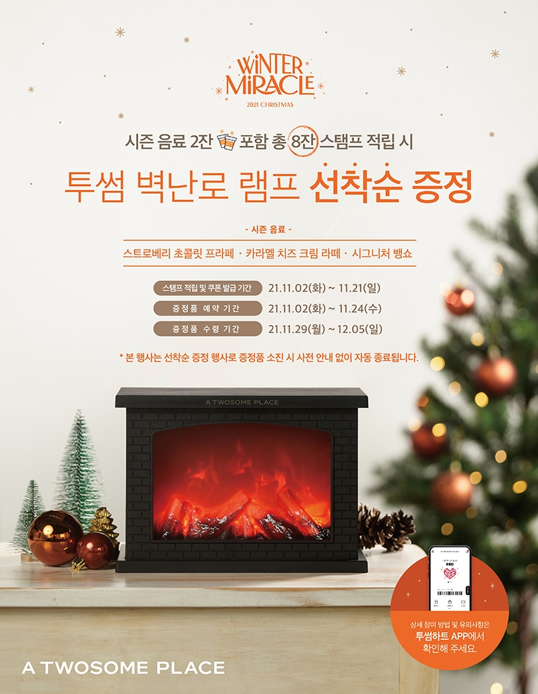 벽난로 램프를 증정하는 ‘스탬프 적립 이벤트’는 오는 21일까지 겨울 시즌 음료 2잔을 포함해 제조 음료 총 8잔을 구매하고 스탬프 적립을 완료한 고객에게 사은품(‘투썸 벽난로 램프’)을 증정하는 행사다. ‘투썸하트’ 앱 회원이면 누구나 참여할 수 있다.