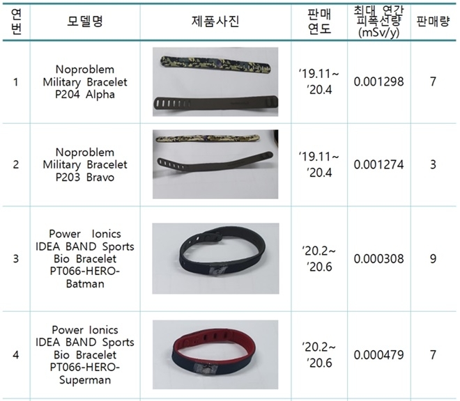 원안위가 이 회사 제품을 분석한 결과 팔찌 12종의 연간 방사선피폭선량은 0.0002~0.0013mSv(밀리시버트·사람 몸에 노출된 방사선 양을 나타내는 단위)다. 이는 생활방사선법상 가공제품에 적용하는 안전기준(연간 1mSv)을 초과하지는 않았다.