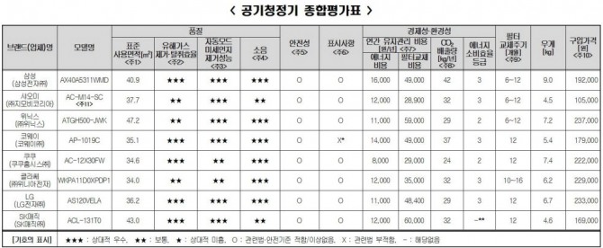 공기청정기 종합평가표. 사진=한국소비자원이미지 확대보기