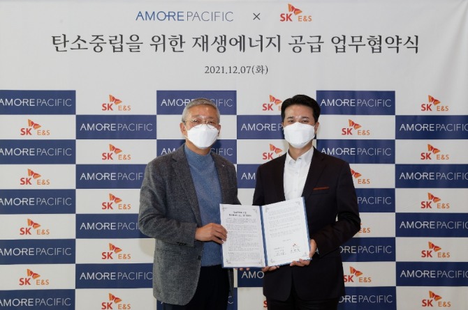 7일 아모레퍼시픽 본사에서 진행된 협약식에서 아모레퍼시픽은 SK E&S의 재생에너지를 안정적으로 공급받아 지속가능경영 약속을 이행하고 RE100(기업이 사용하는 전력 100%를 재생에너지로 충당한다는 캠페인) 달성을 가속화하기로 약속했다.