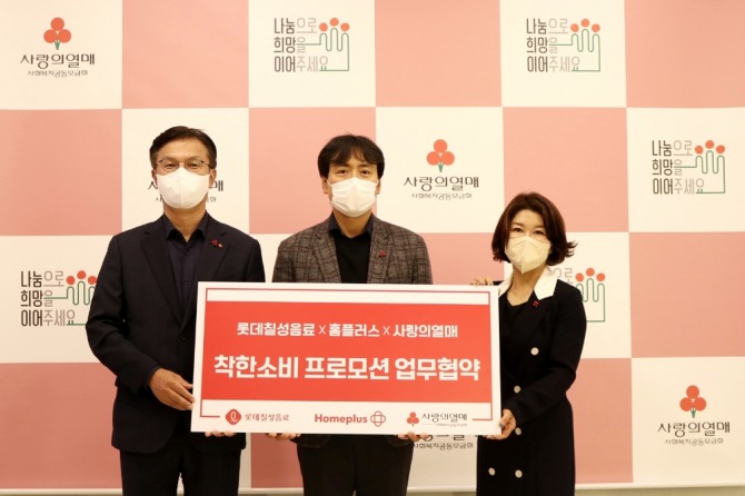 이미지 확대보기먼저 롯데칠성음료는 ‘홈플러스', '사랑의열매 사회복지공동모금회’(이하 사랑의열매)와 함께 이웃사랑을 위한 사회공헌활동 ‘착한 소비 캠페인’을 펼친다. 협약식은 지난 8일 서울 중구 사랑의열매 별관에서 이뤄졌다.
