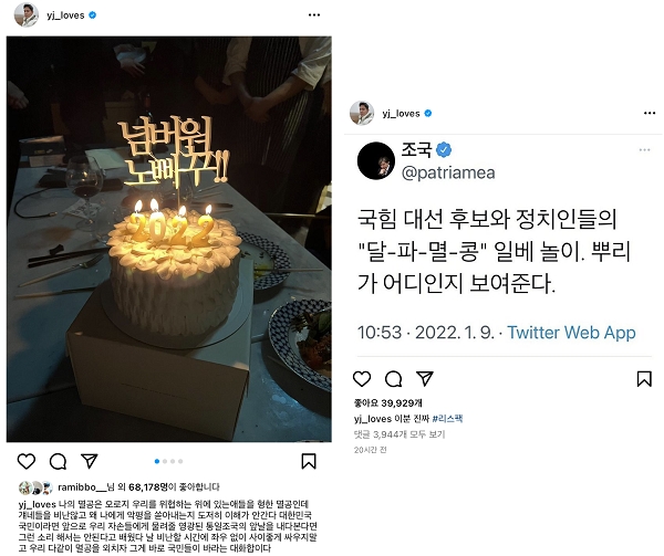같은 날 정 부회장은 조국 전 법무부 장관의 트위터를 캡처한 사진에 ‘리스팩’이라는 해시태그를 단 게시물도 올렸다. 해당 캡처본에는 “국힘 대선 후보와 정치인들의 ‘달-파-멸-콩’ 놀이, 뿌리가 어디인지 보여준다”는 비판글이 담겼다.
