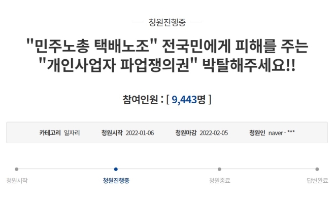 익명의 청원자는 지난 6일 자신을 택배업계 종사자라고 밝히며 “노동자의 권익을 주장하지만 실상은 자신들의 이익만을 추구하는 개인사업자 택배노조의 만행을 강력히 제재해달라”고 청원했다.
