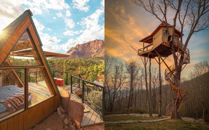 미국 유타에 위치한 ‘자이온 에코캐빈’(왼쪽)과 노스캐롤라이나에 있는 ‘레이븐 룩 트리하우스'. 사진=에어비앤비