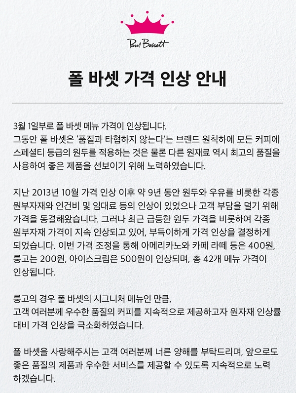 이에 폴 바셋의 아메리카노는 4300원에서 4700원으로 인상된다. 폴 바셋 시그니처인 룽고는 4700원에서 4900원으로 가격이 조정된다.