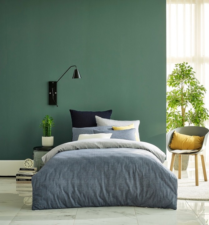 비투비는 모노톤 색상의 침구로 파랑과 회색을 양면에 사용했고 작은 크기의 점무늬로 포인트를 줬다.