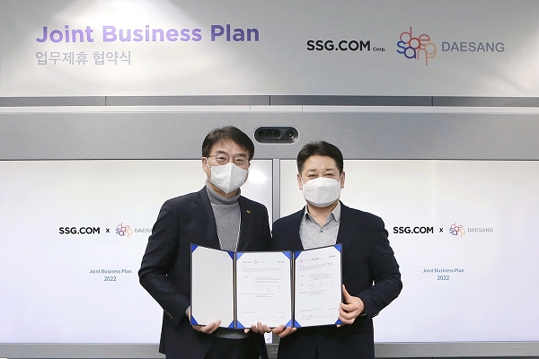 황운기 SSG닷컴 상품본부장(오른쪽)과 이강덕 대상 영업본부장이 업무제휴협약 체결 후 기념사진 촬영을 하고 있다. 사진=SSG닷컴 제공