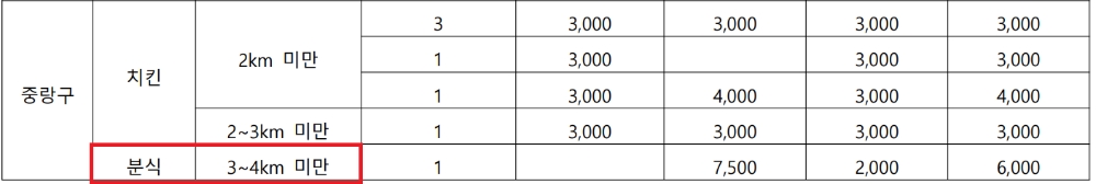 수정된 내용은 중랑구 분식 메뉴의 '거리' 항목으로, '2~3km 미만'에서 '3~4km 미만'으로 바뀌었다.