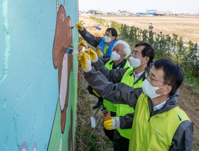 이미지 확대보기이날 행사는 농협금융에서 나눔축산운동본부에 지난 1월 전달한 ESG펀드(NHAmundi 100년 기업 그린코리아 펀드) 조성기금(1억원)을 통해 진행됐으며, 안병우 농협경제지주 축산경제대표이사와 손병환 NH농협금융지주 회장, 박학주 NHAmundi자산운용대표이사가 축사 주변 방취림 식재, 농장 벽화그리기 등에 참여해 의미를 더했다.