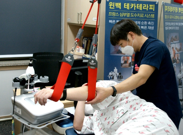 이번에 도입한 윈백 테카테라피 치료는 고주파 전류를 이용해 체내의 온도를 높여 혈류량을 증가시키고 근육을 이완시켜주는 것으로 통증과 염증을 개선해준다. 근육통·오십견·테니스엘보우·섬유근막통증·손목터널증후군 등에 윈백 테카테라피 치료를 적용할 수 있다. 또 물리치료사의 손으로 치료하기 어려운 인체 깊숙한 곳까지 심부열을 전달할 수 있어 목·어깨·팔·허리·무릎·발목 등 신체의 모든 부위 치료가 가능하다.