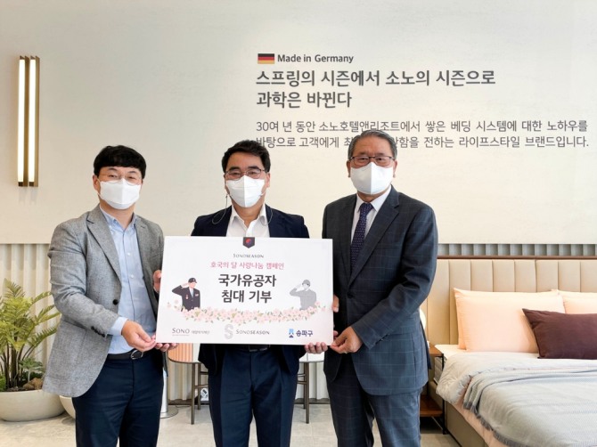 이미지 확대보기소노시즌은 지난 23일 브랜드 직영점인 '소노시즌 송파점'에서 기증식을 갖고 3000만원 상당의 메모리폼 매트리스와 침대 프레임을 송파구에 기탁했다. 기증된 제품은 송파구 거주 국가유공자 가정에 전달된다.