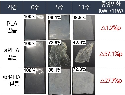 해양 생분해 실험서 aPHA·scPHA 필름 무게 각각 57%, 28% 감소