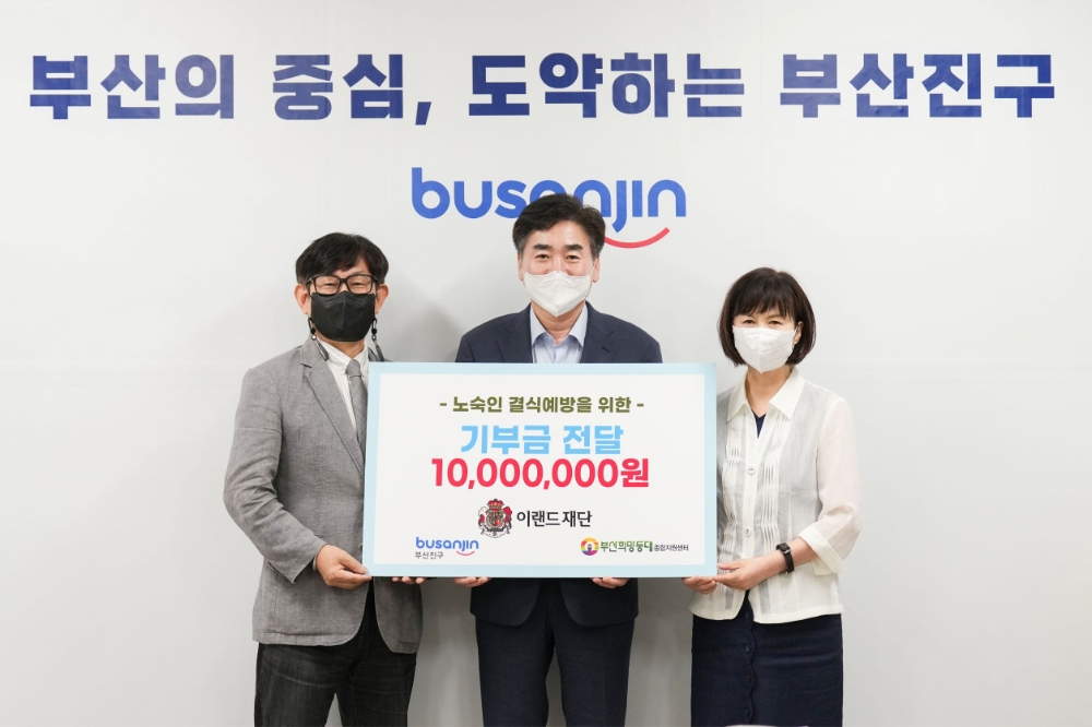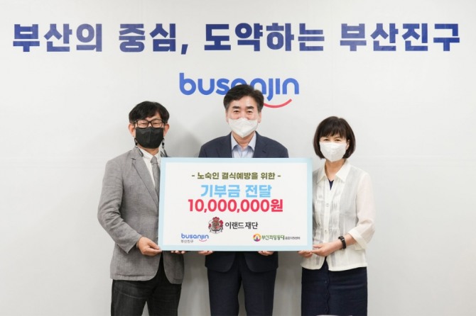 이미지 확대보기지난 26일 열린 기부금 전달식은 부산시 부산진구에 위치한 부산진구청에서 개최됐다. 이번 전달식에는 정영일 이랜드재단 경영고문, 김영욱 부산진구 구청장, 최영호 이랜드자산개발 대표이사 등 관련 임직원이 참석했다.