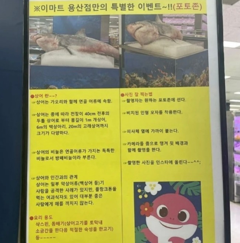 이미지 확대보기1일 지역 맘카페에 따르면 이마트 용산점은 지난달 30일 수산물 코너에서 상어 포토존 이벤를 열었다. 상어 포토존에는 죽은 상어 한 마리를 통째로 전시했다.