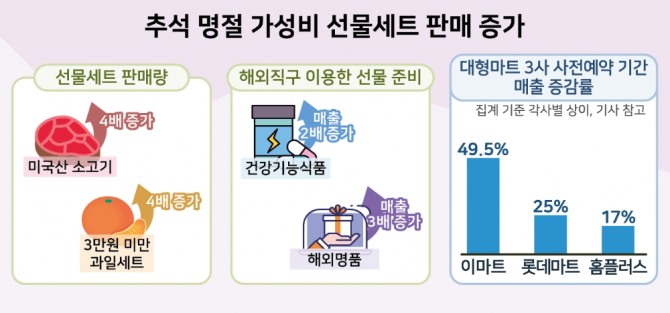 이마트는 지난달 21일 시작해 이달 29일까지 추석 선물세트 사전예약 매출액이 지난해 같은 기간보다 49.5% 증가했고 롯데마트는 사전예약 기간 내 매출(8월1~15일)이 전년과 비교해 25% 이상 늘었다. 홈플러스(7월21일~8월21일)도 이 기간 선물세트 매출이 17% 이상 올랐다.