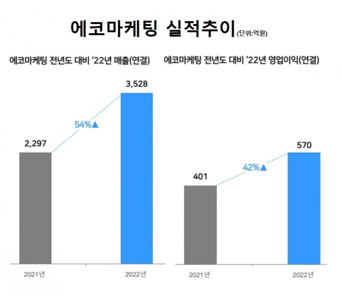 이미지 확대보기에코마케팅은 지난해 연결기준 매출액이 3528억원, 영업이익은 570억원을 기록했다고 16일 밝혔다. 이는 각각 전년대비 54%, 42% 증가한 수치로 매출 기준 역대 최대 실적이다. 대내외적인 경기 침체에도 불구 지난해 최대 실적을 기록한데는 자회사인 데일리앤코, 안다르를 포함한 3사 모두 전년 대비 매출과 영업이익 모두 큰 폭으로 증가한 것이 주효했다는 회사측 설명이다.