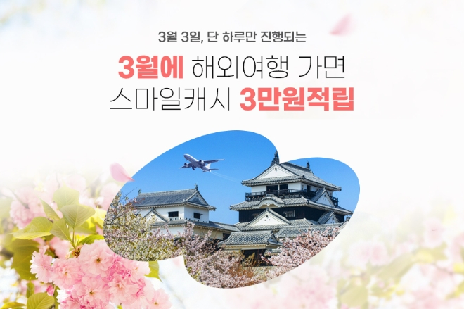 이미지 확대보기‘3월 해외여행 스마일캐시 적립’ 프로모션은 오는 3일, 3월 출발 해외항공권을 구매한 고객을 대상으로, 총 3만원의 스마일캐시가 적립되는 이벤트다.