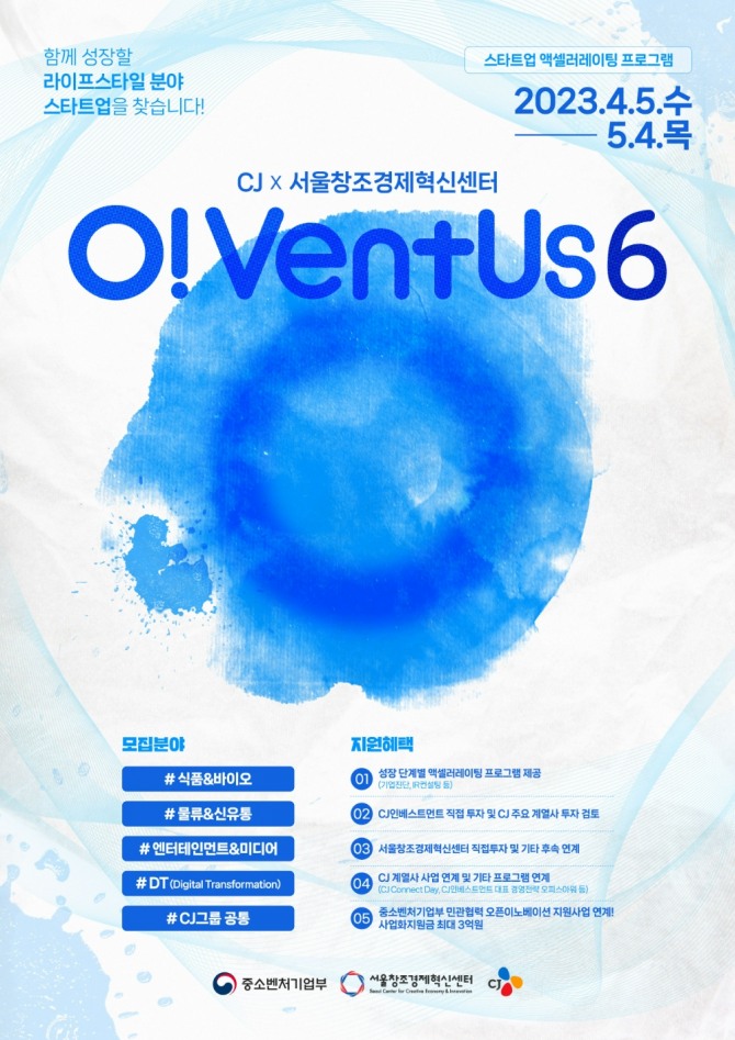 모집 대상은 △식품&바이오 △물류&신유통 △엔터테인먼트&미디어 △디지털전환 △기타 CJ그룹에 제안하고 싶은 신규 비즈니스 등 라이프스타일 분야에서 창업 3년 이내, 포스트밸류(투자유치 후 기업가치) 50억원 내외의 초기 스타트업이다. 오벤터스 홈페이지를 통해 자세한 모집일정과 참가자격을 확인 및 지원할 수 있다.