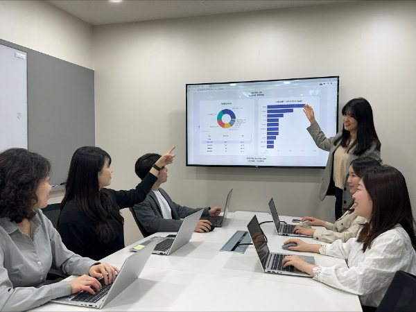이미지 확대보기풀무원 관계자가 AI 고객 경험 분석 시스템 ‘AIRS(AI Review analysis System)’를 활용해 회의를 진행하고 있다. 사진=풀무원.