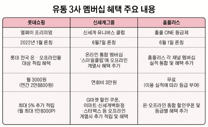 6일 업계에 따르면 ‘멤버십 경쟁 격전지’가 온라인 플랫폼에서 유통업계 전반으로 확산되며 고객 확보에 치열한 경쟁이 벌어질 전망이다. 이달 들어서만 홈플러스가 ‘홈플 ONE 등급제’를 선보였고, 롯데홈쇼핑이 멤버십 ‘엘클럽’ 개편을 알렸다. 신세계그룹은 오는 7일 ‘신세계유니버스클럽’ 론칭을 앞두고 있다.