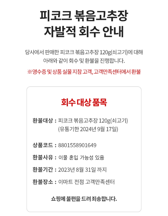 회수 대상은 2023년 3월 30일부터 6월 16일까지 판매된 ‘피코크 쇠고기 볶음 고추장’ 중 품질유지기한이 2024년 9월 17일로 표기된 상품이다.