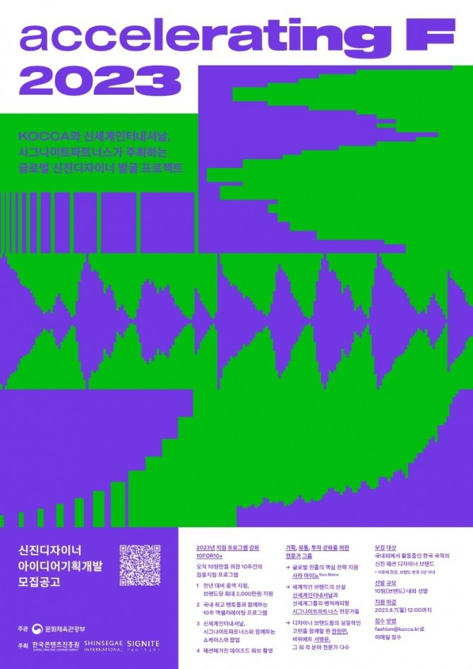 콘진원 지경화 한류지원본부장은 “올해 새롭게 시작한 ‘액셀러레이팅 F’ 프로젝트는 독창적이고 잠재력 높은 신진 패션 디자이너를 발굴하여 스타트업처럼 육성하겠다. 주요 기업과의 파트너십을 통하여 실질적인 조언과 네트워크를 구축할 수 있는 환경을 제공하겠다”고 전했다.