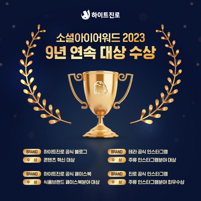 이외에도 하이트진로 공식 페이스북이 SNS에서 유행하는 이슈와 밈(Meme)에 당사 제품이 자연스럽게 녹아들 수 있도록 공감과 소통을 유도해 식품브랜드 대상을 수상하고, 취미 생활 등 라이프스타일을 반영한 하이트진로 공식 블로그는 콘텐츠 혁신 대상을 수상했다. 하이트진로의 SNS 브랜딩 활동은 소비자들의 자발적 참여를 유도하고 콘텐츠를 확산하는 쌍방향 소통 채널로 자리잡았다는 평가다.