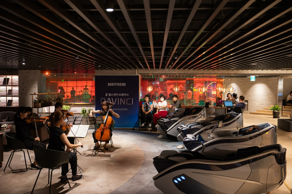 최근 출시된 안마의자 ‘다빈치’와 1인용 마사지소파 ‘파밀레’를 이용하며 바이올린, 첼로, 비올라로 이뤄진 실내악 4중주를 감상하는 연주회로, 몸과 귀를 모두 편안하게 하는 체험 행사였다. 이날 하루에만 고객 300여명이 현장에서 제품 체험 및 힐링콘서트를 즐겼다.