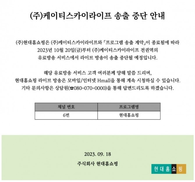 이미지 확대보기이는 현대홈쇼핑과 KT스카이라이프 간의 ‘프로그램 송출 계약’ 종료에 따른 것이다.