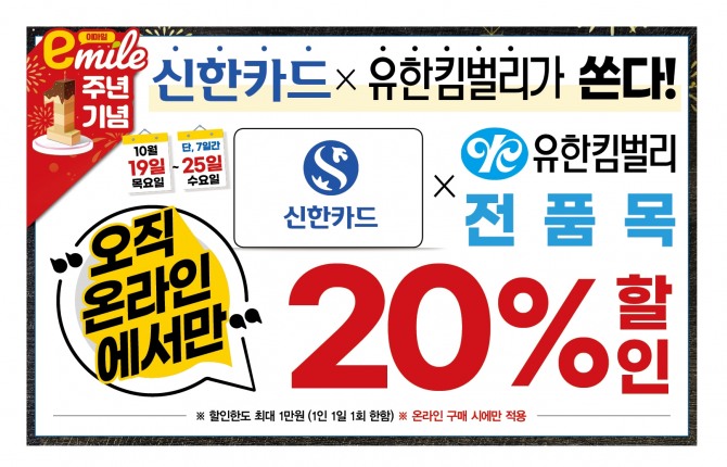 이미지 확대보기이마트에브리데이는 19~25일까지 온라인몰 e마일에서 신한카드 결제 시 유한킴벌리 전품목 20% 할인 혜택을 제공한다. 최대 할인액은 1만원이며, 고객 1인 당 1일 1회 할인 혜택을 받을 수 있다.