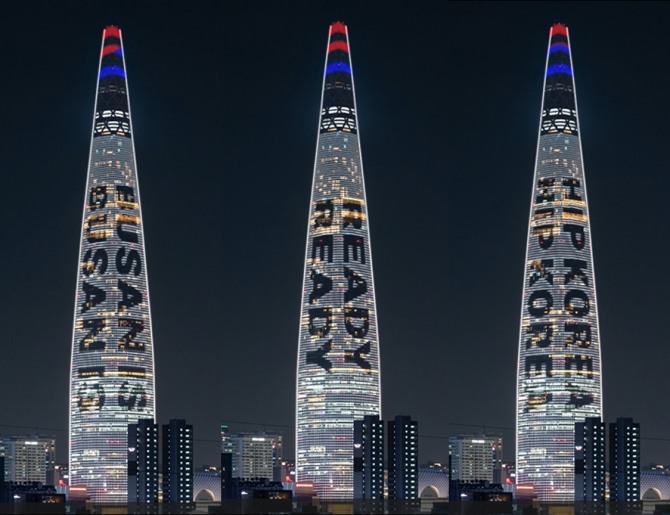 이미지 확대보기30일 롯데물산에 따르면 2030 세계박람회 개최지 투표가 한 달여 앞으로 다가온 가운데, 롯데월드타워는 미디어파사드에 부산세계박람회 유치를 기원하는 ‘BUSAN IS READY’, ‘HIP KOREA’, ‘2030 BUSAN EXPO’ 메시지를 띄운다.