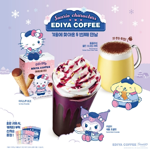 폼폼푸린 골든 슈크림 라떼는 커스터드와 카라멜향이 어우러진 라떼에 크림과 코코아파우더를 더한 제품이다. ‘헬로키티 아이스콘 초코’는 컬래버 음료와 즐기기 좋다. 굿즈 3종도 선보인다. ‘패브릭 달력’과 시나모롤 머그’, ‘윈터 블랭킷’ 등이다. 충전형 기프트카드도 2종으로 선보인다. 프로모션도 진행한다. 2일부터 전국 매장에서 컬래버 음료 구매 시 음료 1잔 당 캐릭터 부적 1장을 제공하고, 산리오캐릭터즈 기프트카드를 구매하면 랜덤 핀버튼을 증정한다. 공식 홈페이지에서는 협업 음료 2종을 구매하고 적립한 고객 중 100명을 추첨해 굿즈 세트를 증정한다.
