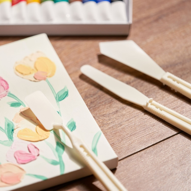 ‘문교 팔레트 나이프’는 세 가지 나이프가 들어 있어, 용도에 맞게 사용하면 된다. 바탕색을 칠하기 좋은 ‘백붓’은 붓 모량이 많아 탄력성이 우수하고, 수채화와 아크릴 물감에 모두 사용이 가능해 초보자가 구매하기 알맞은 상품이다.