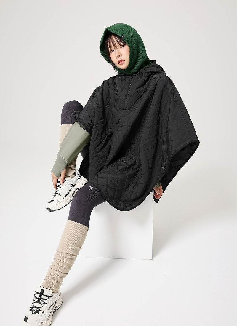 ‘퀼티드 후드 패커플 판초’는 아노락 판초 스타일과 퀼팅 소재로 편안함을 주며, 사이드 부분의 스냅 단추로 여밈이 간편해 활동성을 높였다.