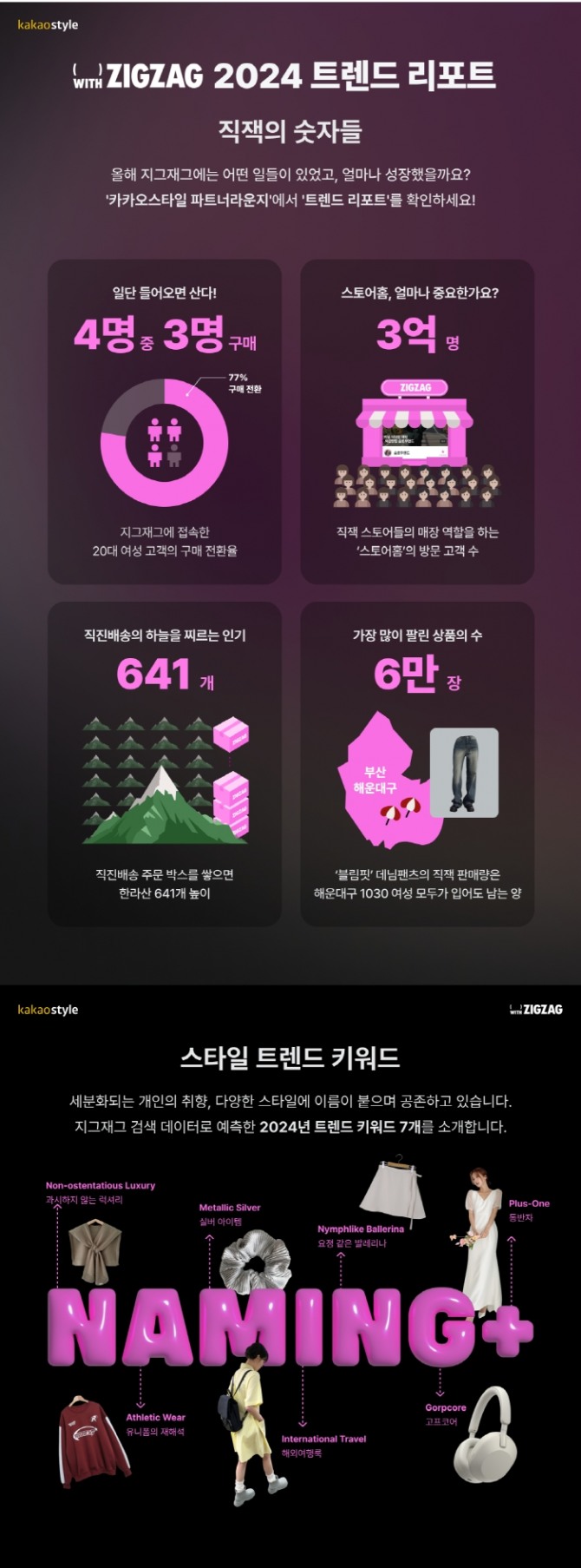 2023년은 유독 다양한 트렌드가 공존했는데, 이는 하나의 스타일로 묶을 수 없을 정도로 개인의 취향이 세분되고 뚜렷하게 나타나고 있기 때문이라고 지그재그 측은 분석했다.