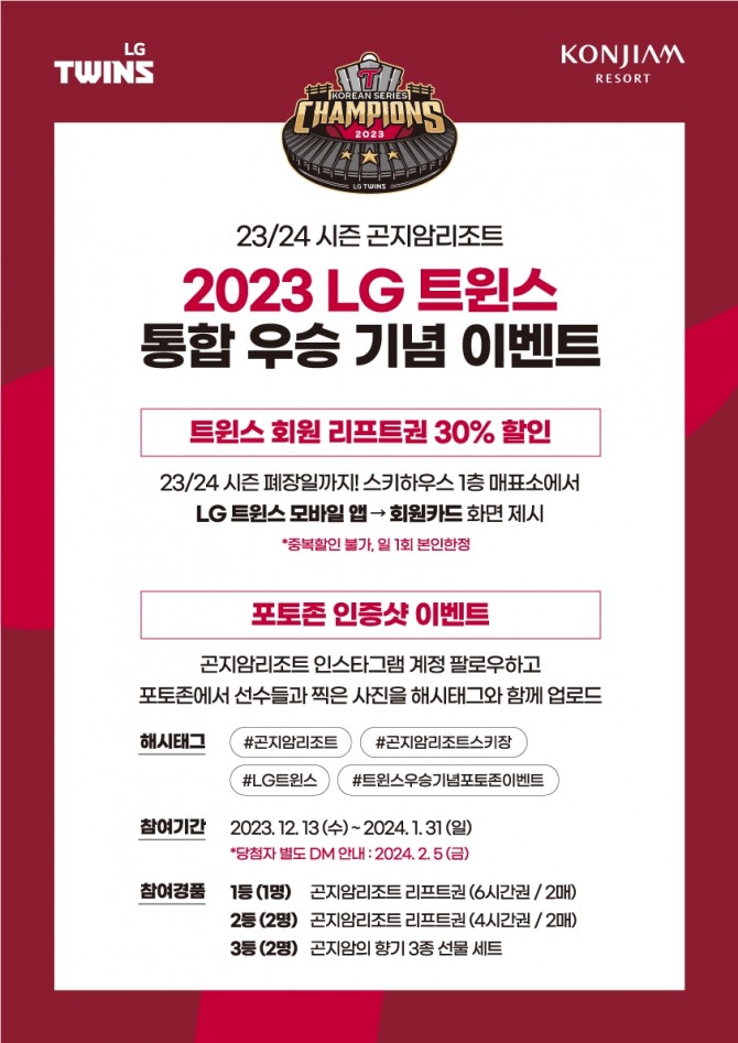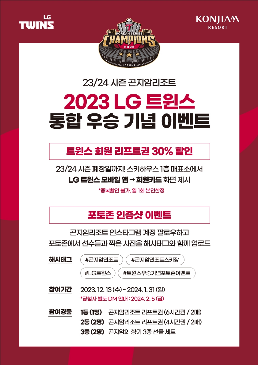 우승 기념 팝업 이벤트는 2023/24 스키시즌 폐장일까지 진행되며, 겨울 대표 레저 스포츠 스키/보드의 즐거움과 LG트윈스 우승의 기쁨을 함께 선사할 예정이다.